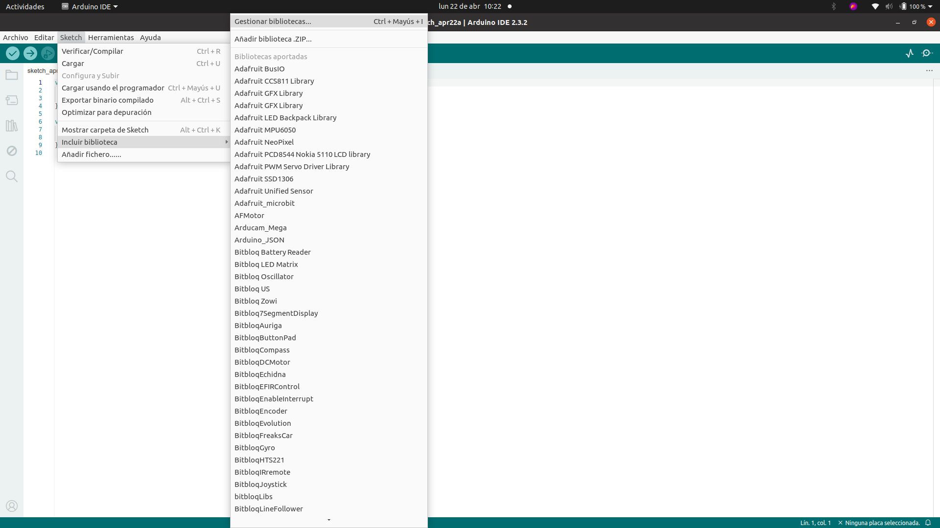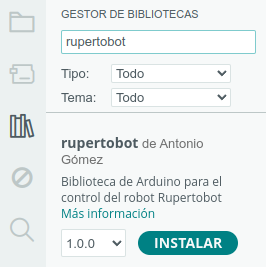 Pues bien, nuestro Rupertobot cuenta con su propia librería para que puedas programarlo y hacerlo funcionar fácilmente. Para ello, desde la IDE de Arduino, vete al menú Sketch->Incluir biblioteca->Gestionar bibliotecas: